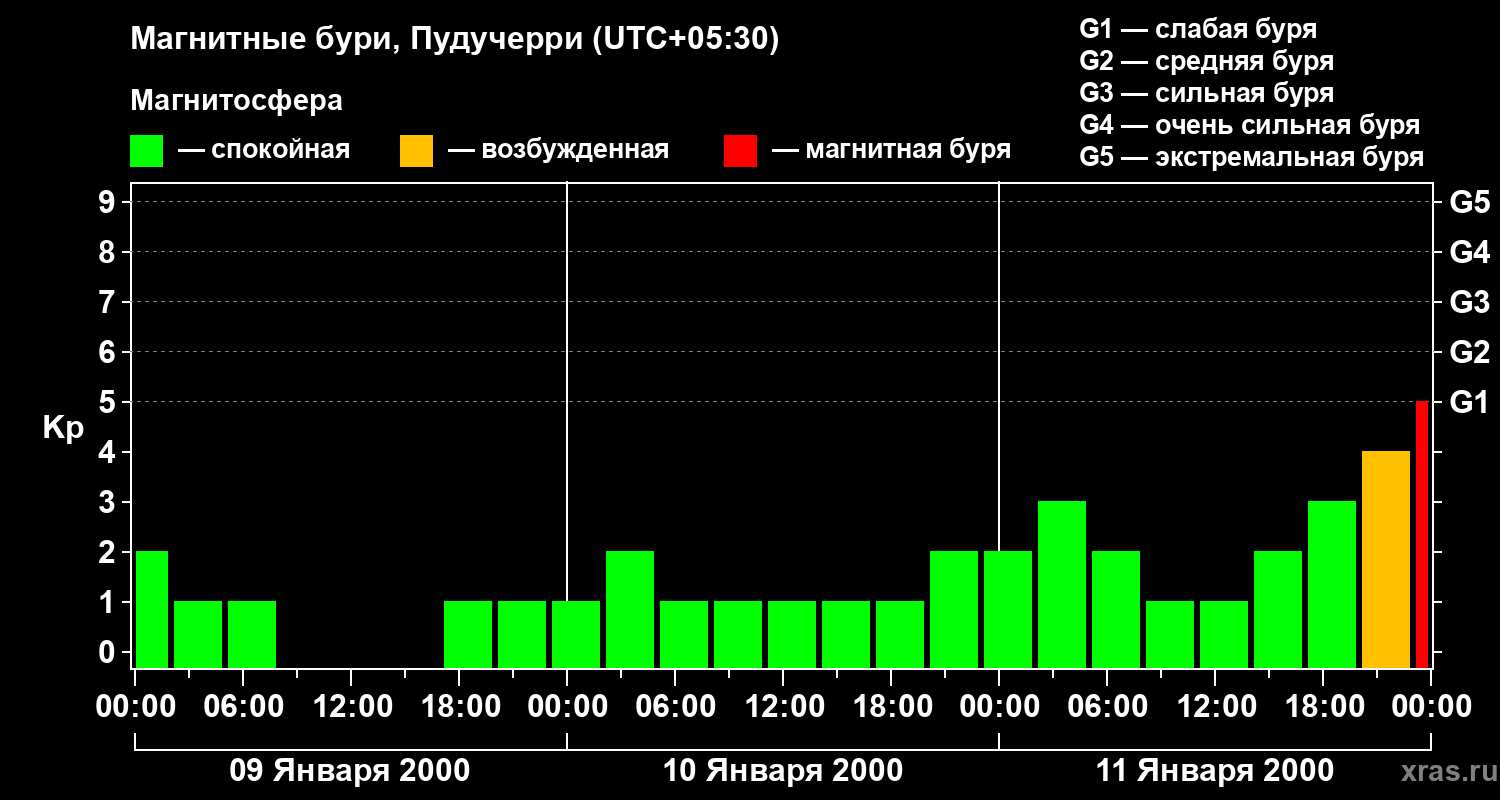 Изменения геомагнитного индекса Kp с 9 по 11 января 2000 года для средних широт
