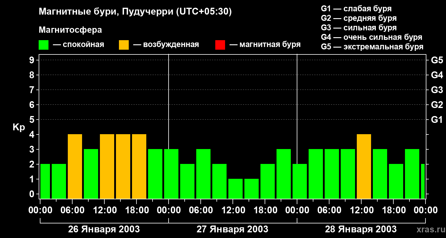 Изменения геомагнитного индекса Kp с 26 по 28 января 2003 года для средних широт