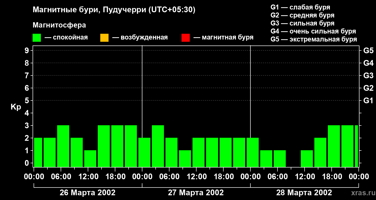 Изменения геомагнитного индекса Kp с 26 по 28 марта 2002 года для средних широт