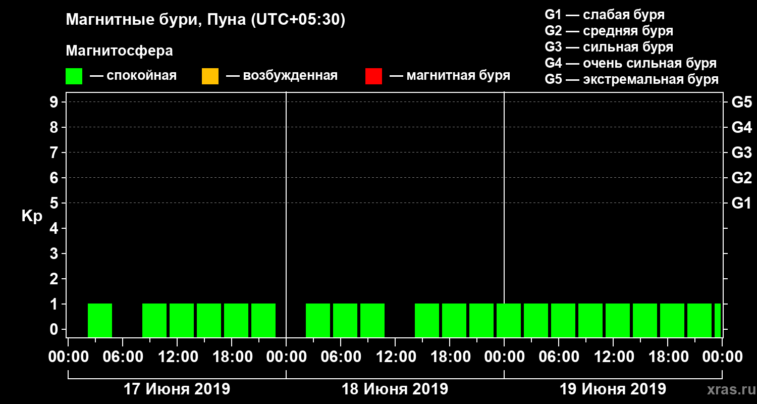 Изменения геомагнитного индекса Kp с 17 по 19 июня 2019 года для средних широт