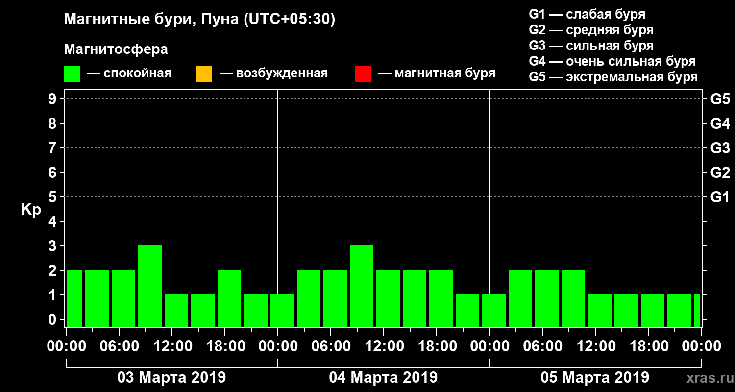 Изменения геомагнитного индекса Kp с 3 по 5 марта 2019 года для средних широт