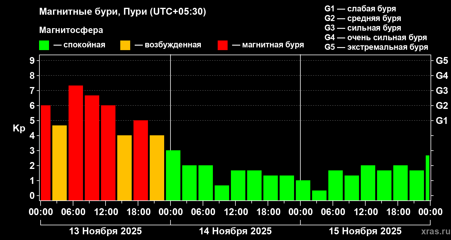 Изменения геомагнитного индекса Kp с 13 по 15 ноября 2025 года для средних широт