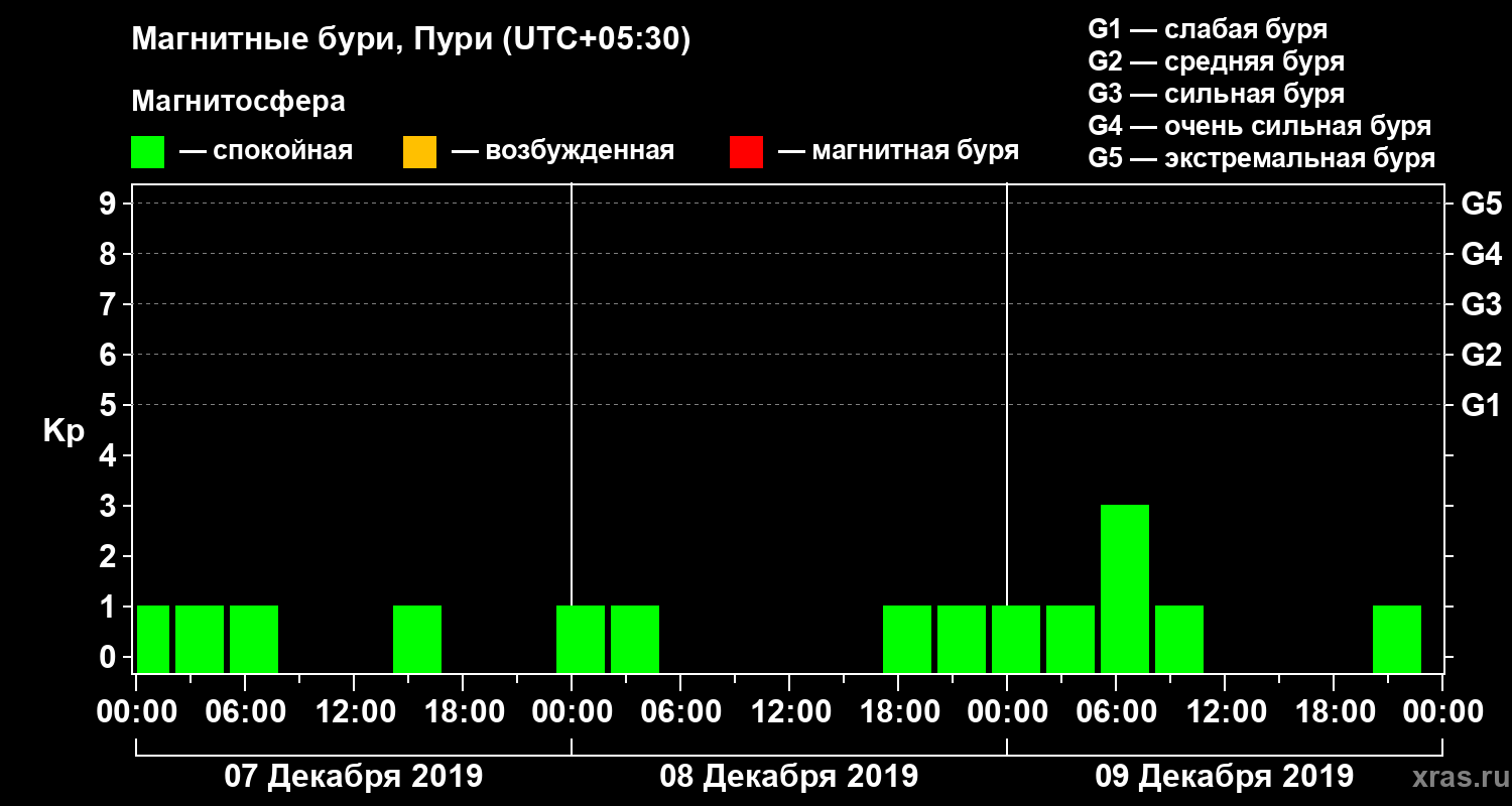 Изменения геомагнитного индекса Kp с 7 по 9 декабря 2019 года для средних широт