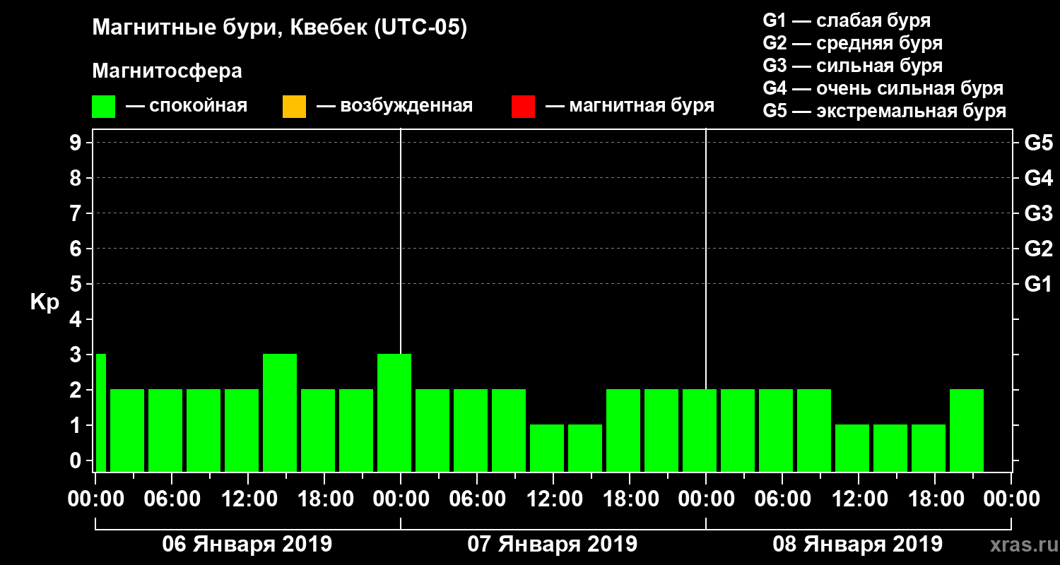 Изменения геомагнитного индекса Kp с 6 по 8 января 2019 года для средних широт