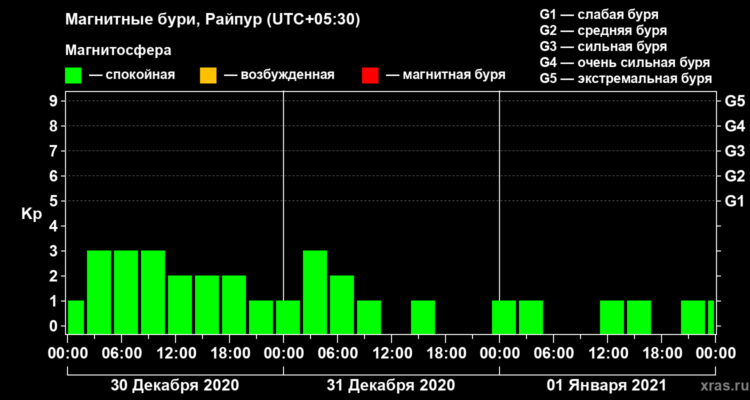 Изменения геомагнитного индекса Kp с 30 декабря 2020 года по 1 января 2021 года для средних широт
