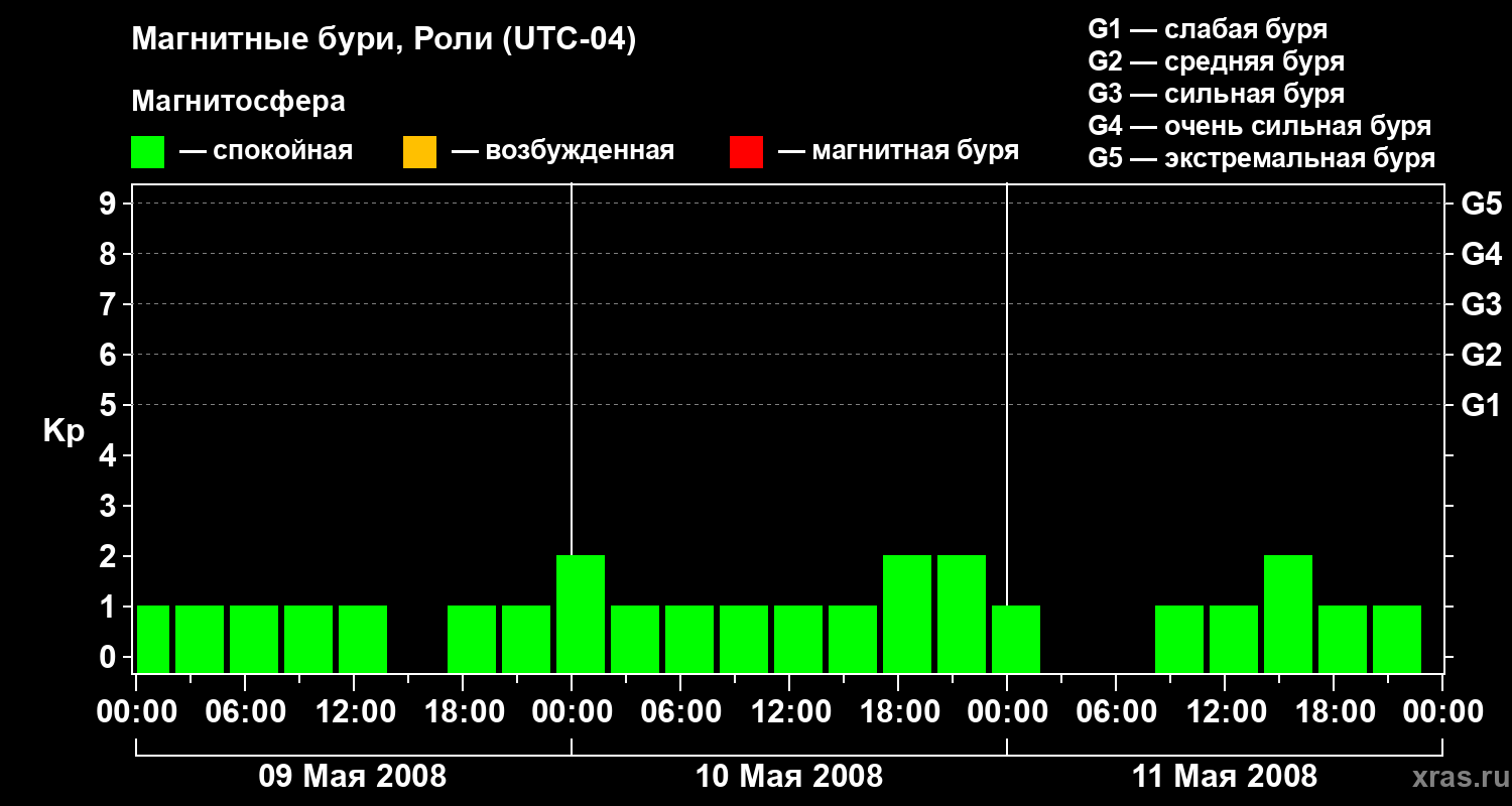 Изменения геомагнитного индекса Kp с 9 по 11 мая 2008 года для средних широт