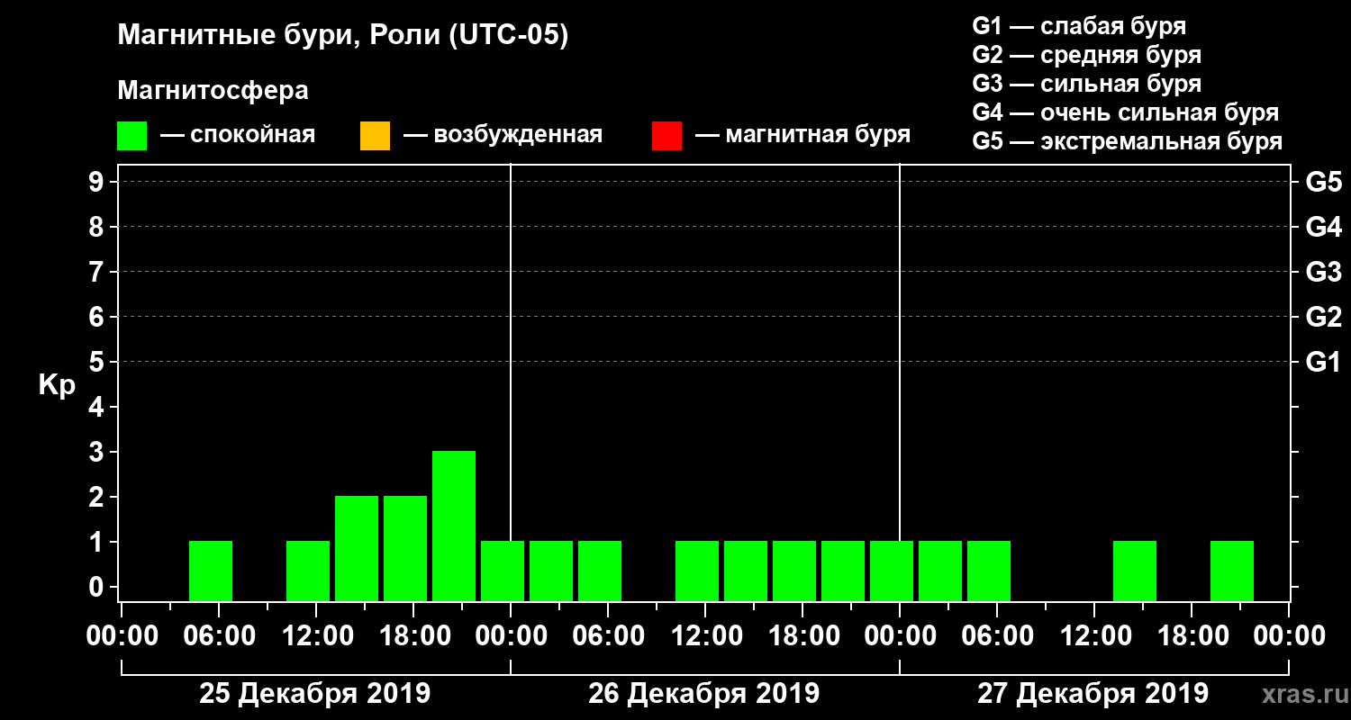 Изменения геомагнитного индекса Kp с 25 по 27 декабря 2019 года для средних широт