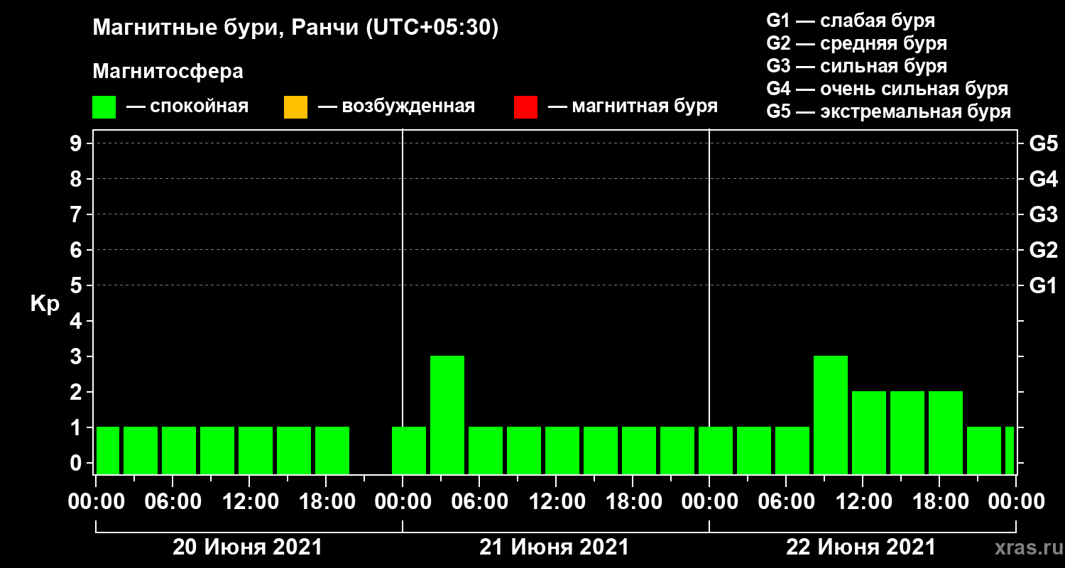 Изменения геомагнитного индекса Kp с 20 по 22 июня 2021 года для средних широт