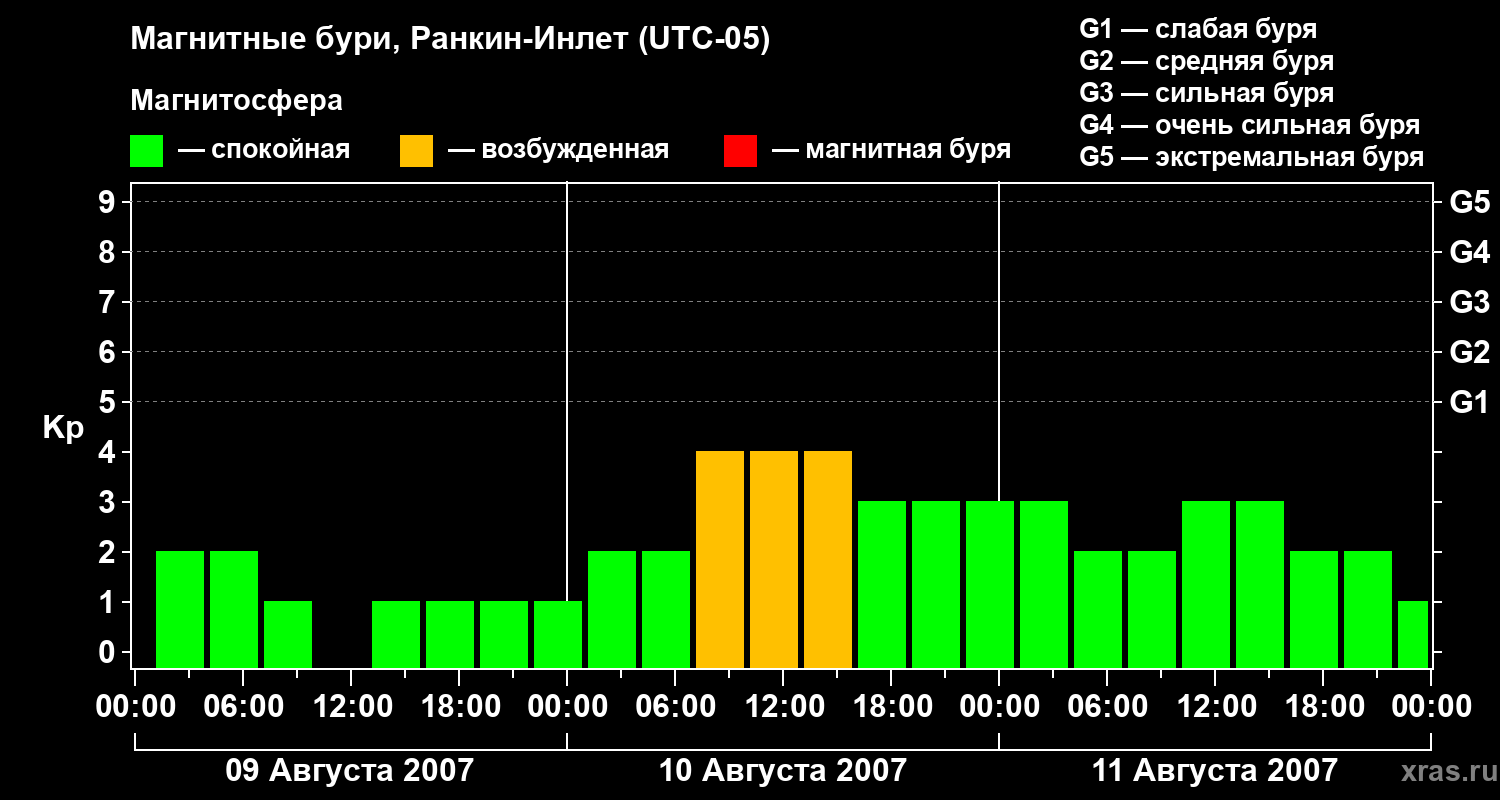 Изменения геомагнитного индекса Kp с 9 по 11 августа 2007 года для средних широт