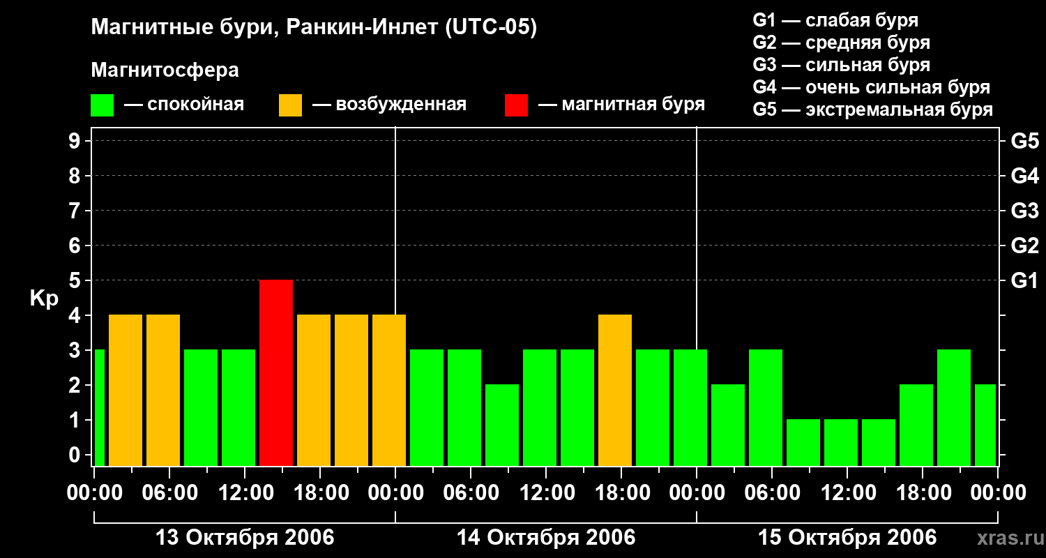 Изменения геомагнитного индекса Kp с 13 по 15 октября 2006 года для средних широт