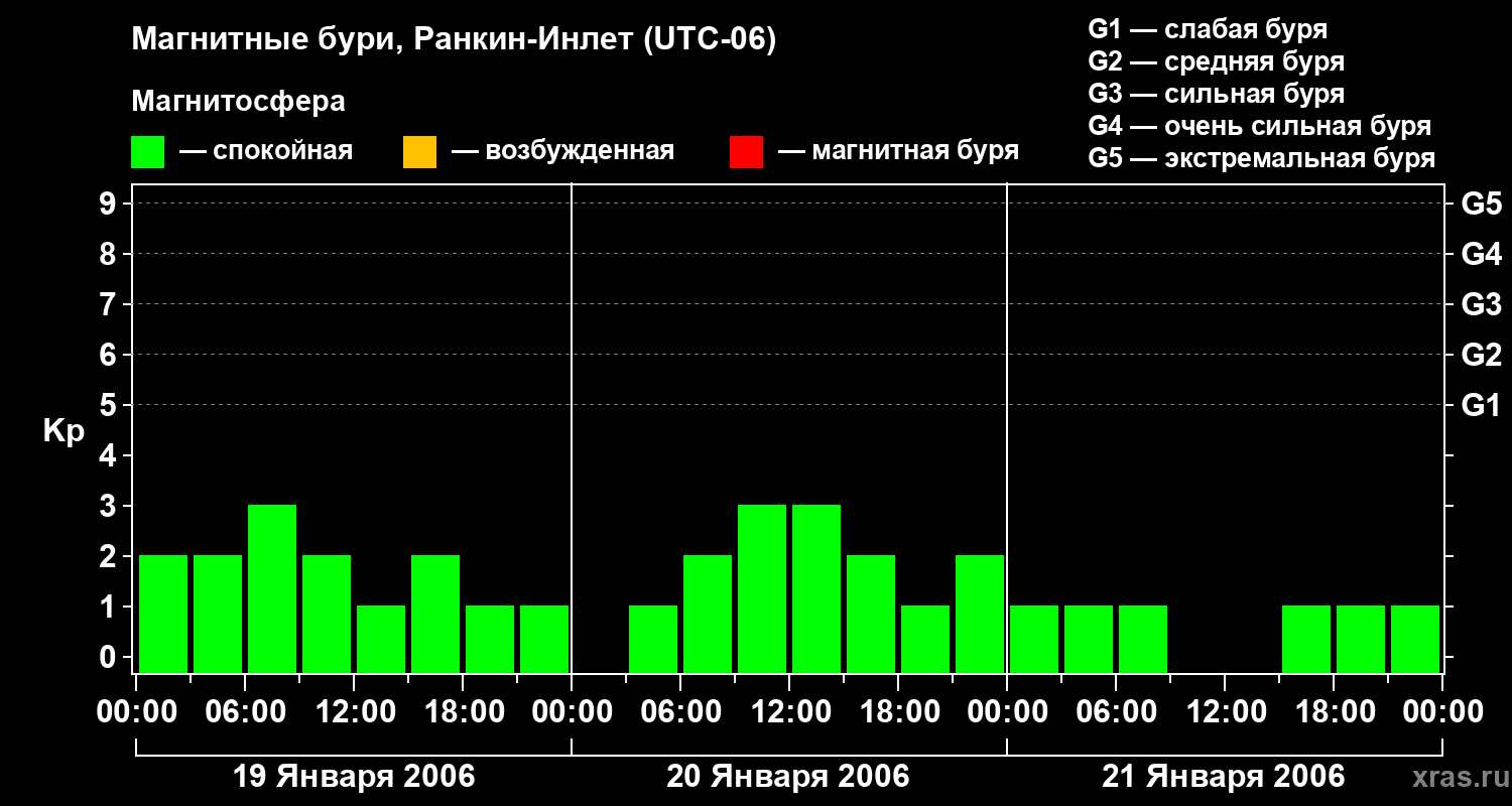 Изменения геомагнитного индекса Kp с 19 по 21 января 2006 года для средних широт