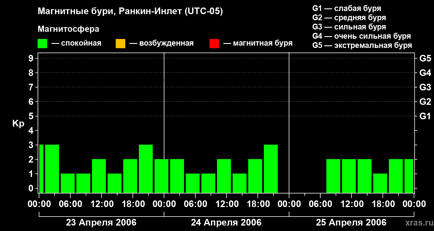 Изменения геомагнитного индекса Kp с 23 по 25 апреля 2006 года для средних широт