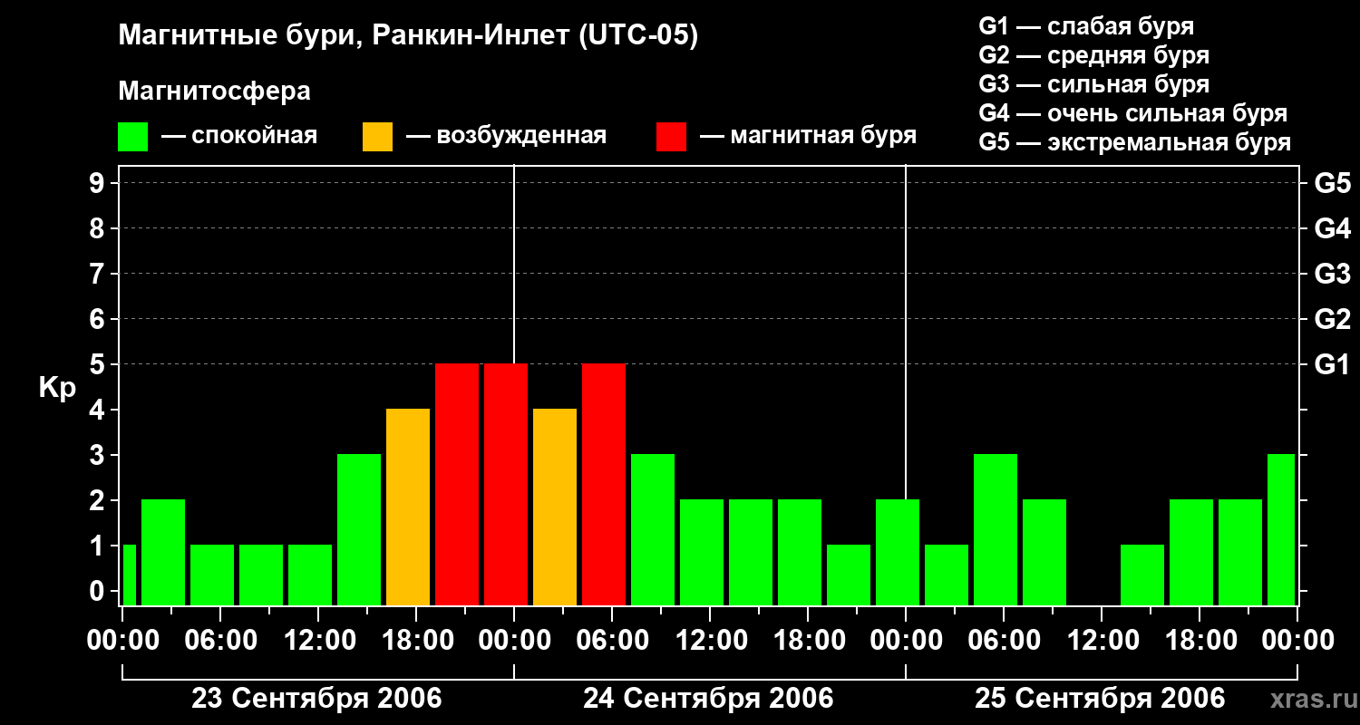 Изменения геомагнитного индекса Kp с 23 по 25 сентября 2006 года для средних широт
