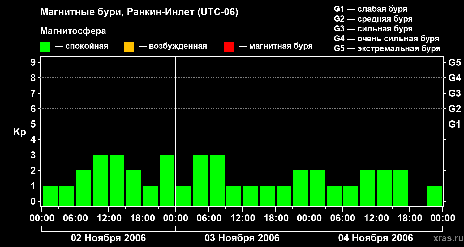 Изменения геомагнитного индекса Kp с 2 по 4 ноября 2006 года для средних широт