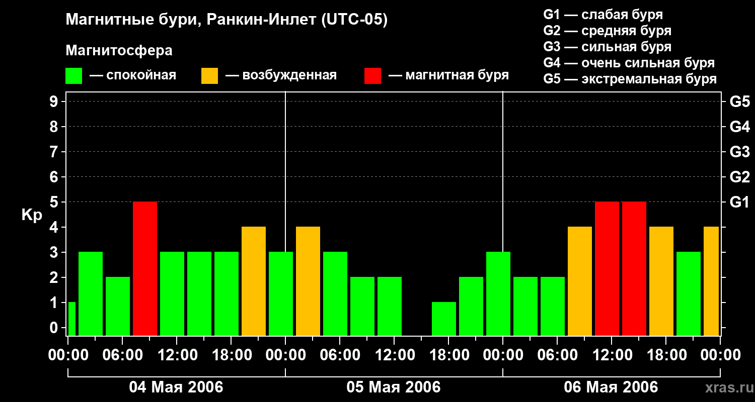 Изменения геомагнитного индекса Kp с 4 по 6 мая 2006 года для средних широт