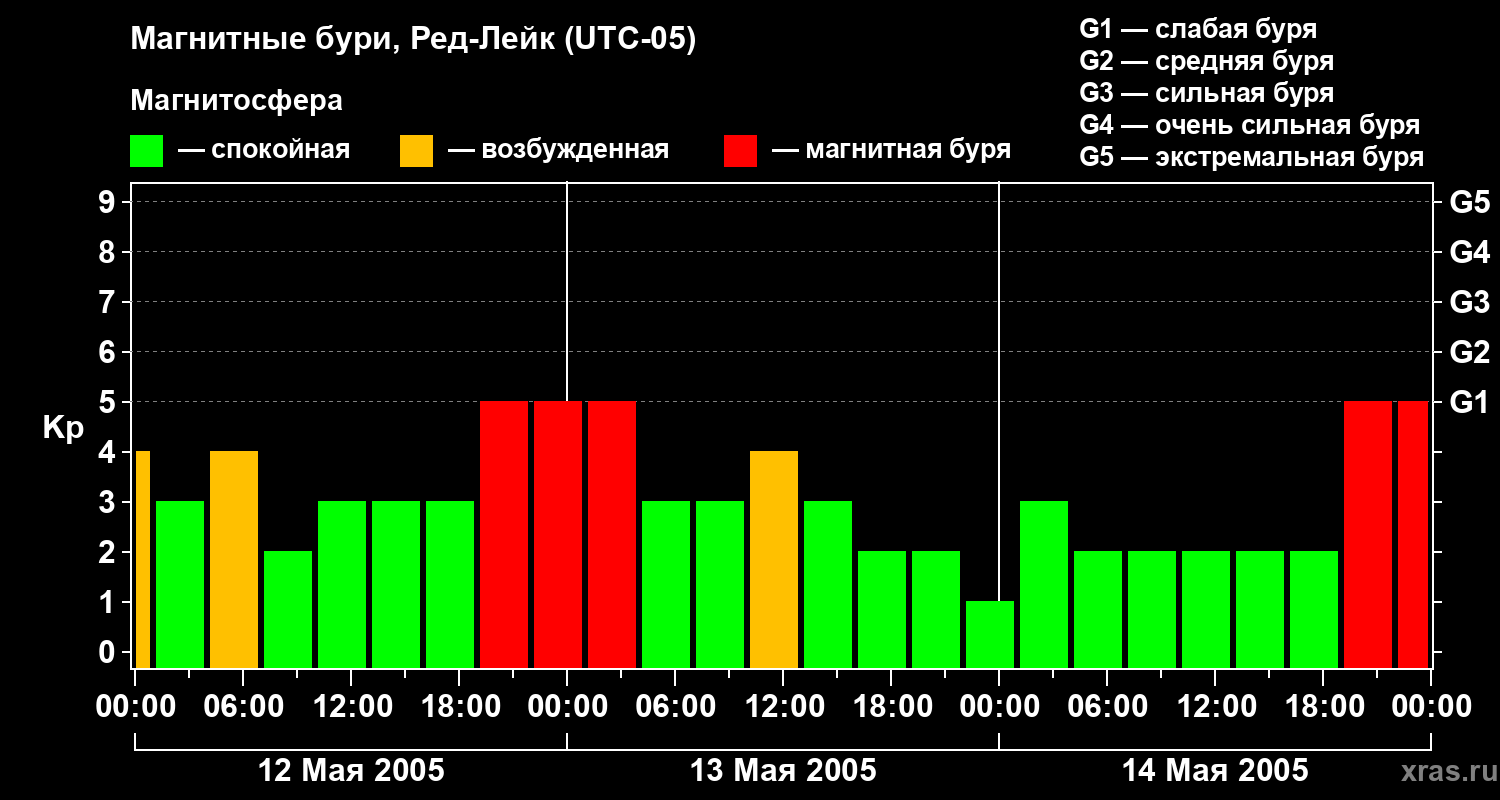 Изменения геомагнитного индекса Kp с 12 по 14 мая 2005 года для средних широт