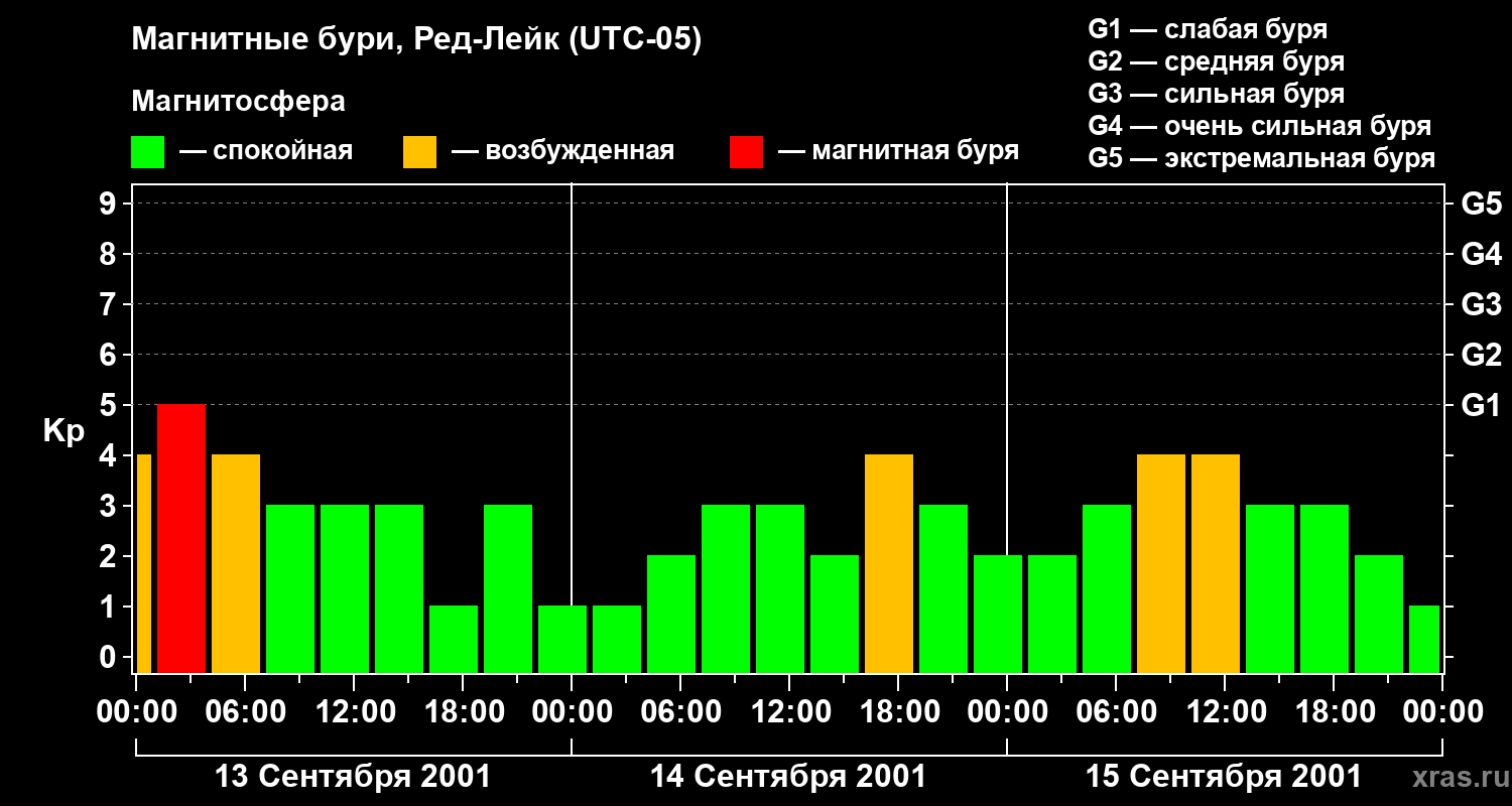 Изменения геомагнитного индекса Kp с 13 по 15 сентября 2001 года для средних широт