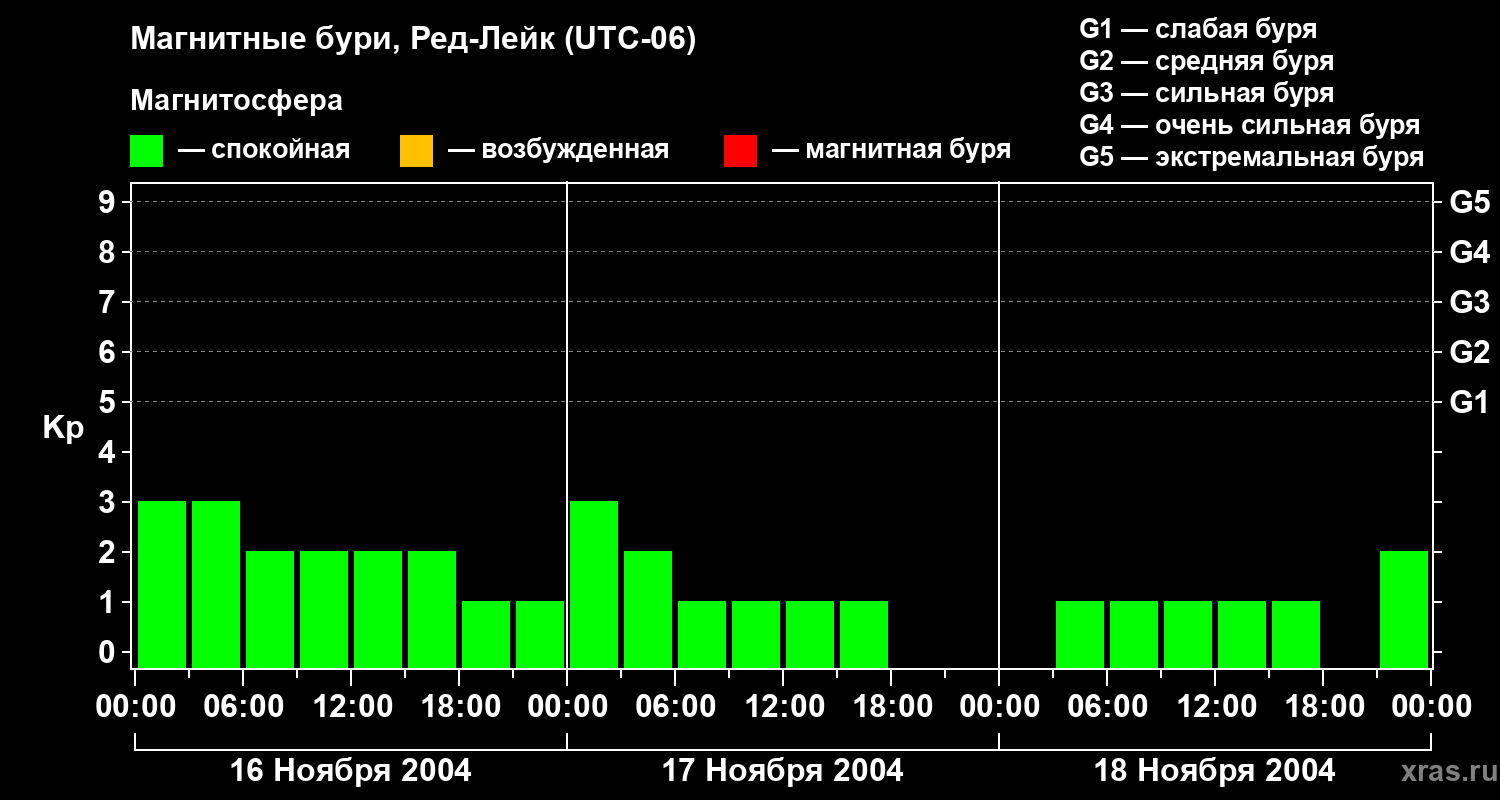Изменения геомагнитного индекса Kp с 16 по 18 ноября 2004 года для средних широт