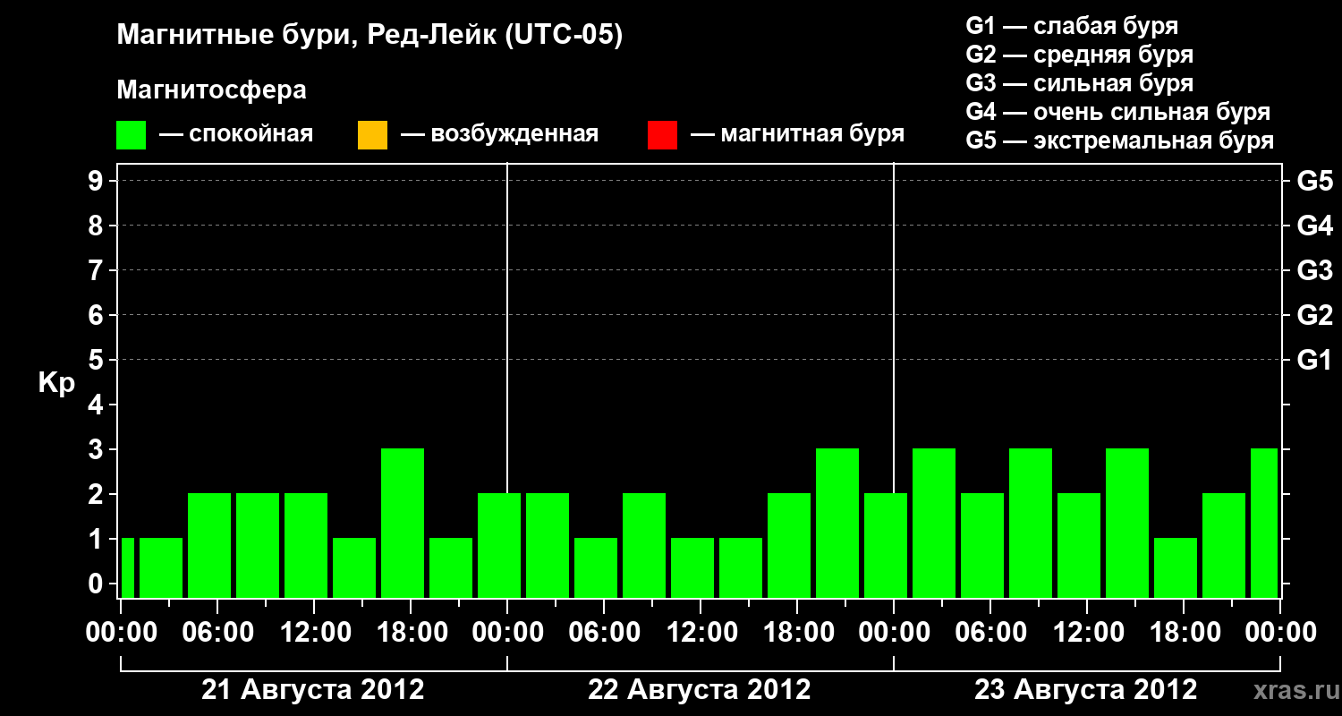 Изменения геомагнитного индекса Kp с 21 по 23 августа 2012 года для средних широт