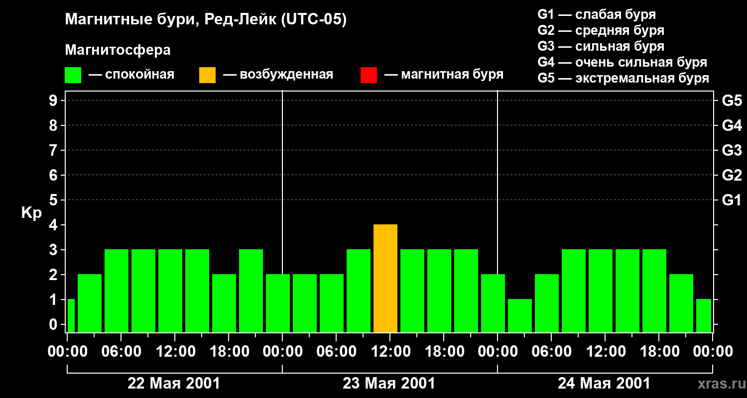 Изменения геомагнитного индекса Kp с 22 по 24 мая 2001 года для средних широт