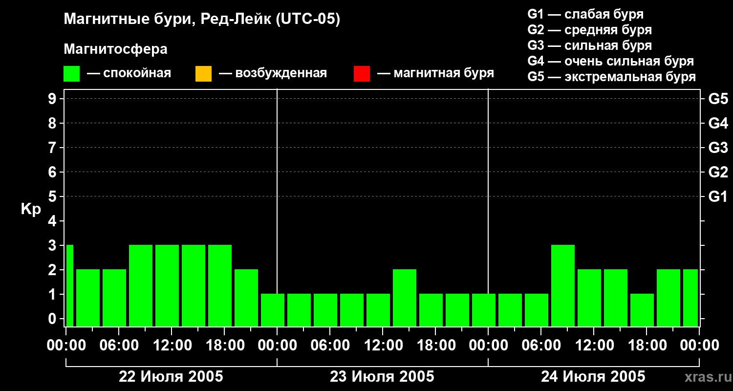 Изменения геомагнитного индекса Kp с 22 по 24 июля 2005 года для средних широт