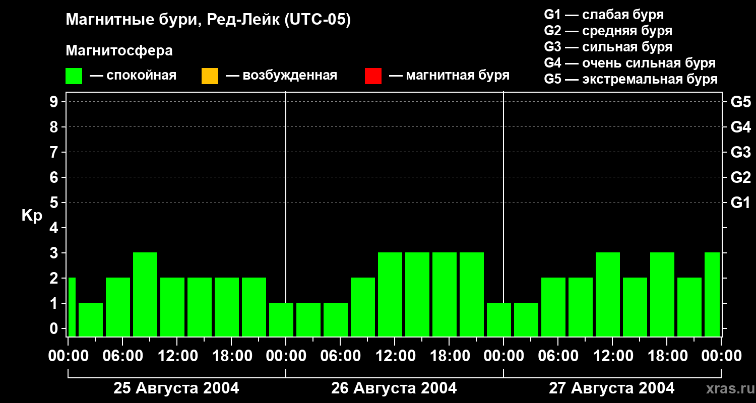 Изменения геомагнитного индекса Kp с 25 по 27 августа 2004 года для средних широт