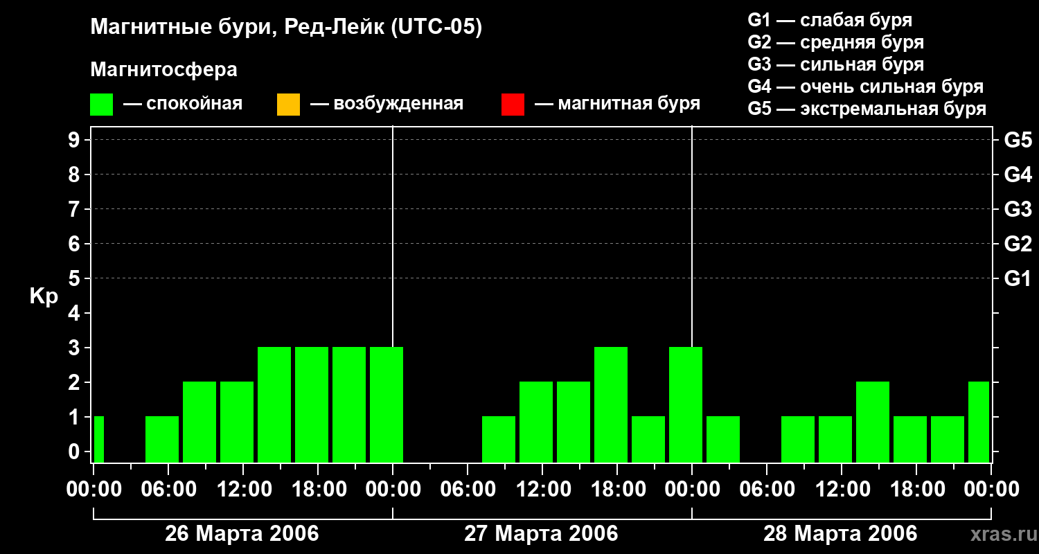 Изменения геомагнитного индекса Kp с 26 по 28 марта 2006 года для средних широт