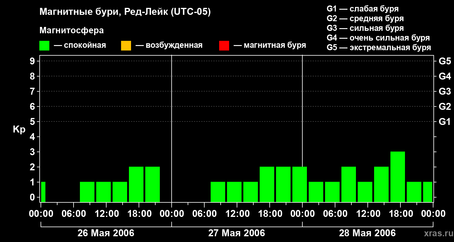 Изменения геомагнитного индекса Kp с 26 по 28 мая 2006 года для средних широт