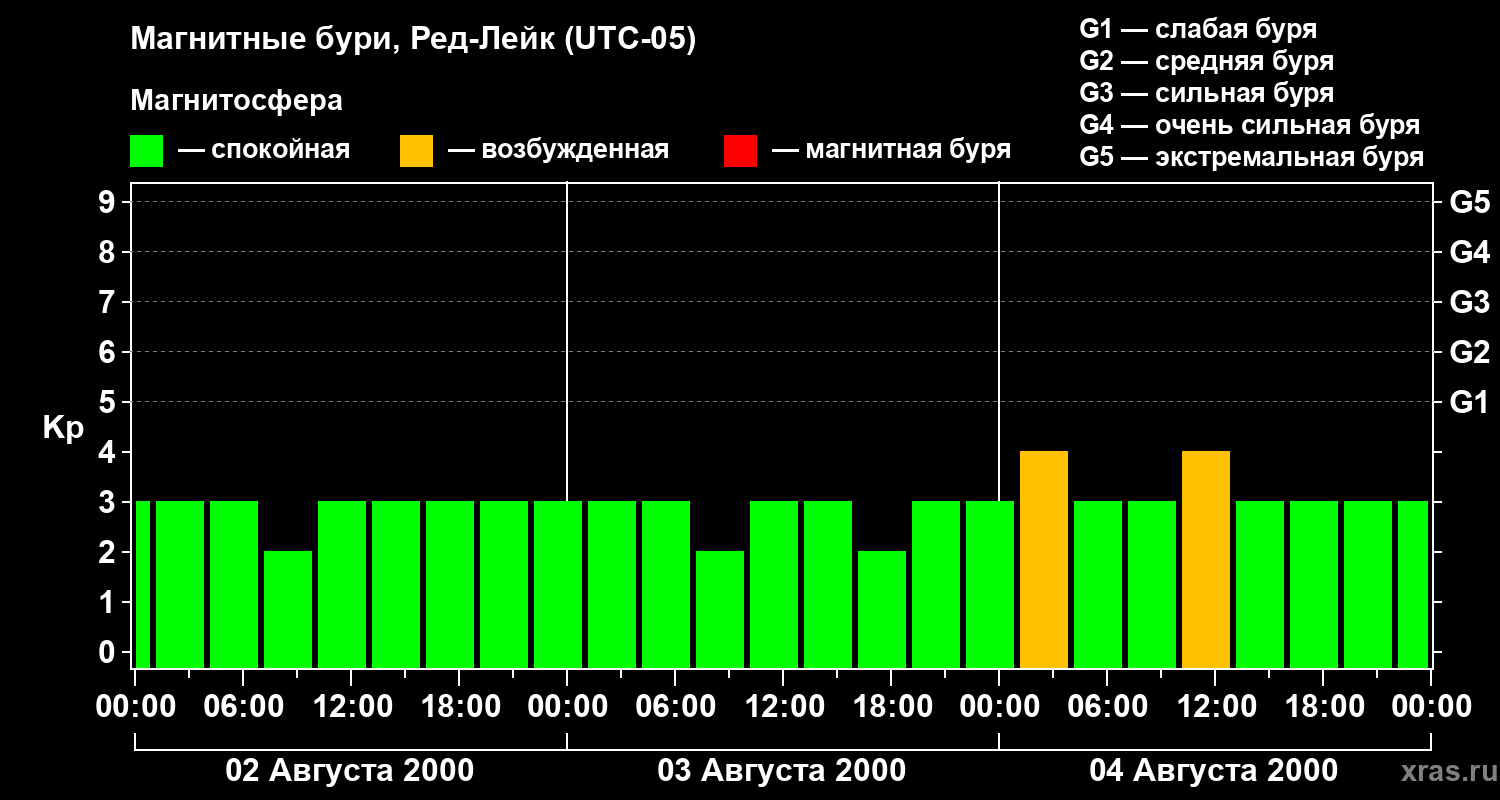 Изменения геомагнитного индекса Kp с 2 по 4 августа 2000 года для средних широт
