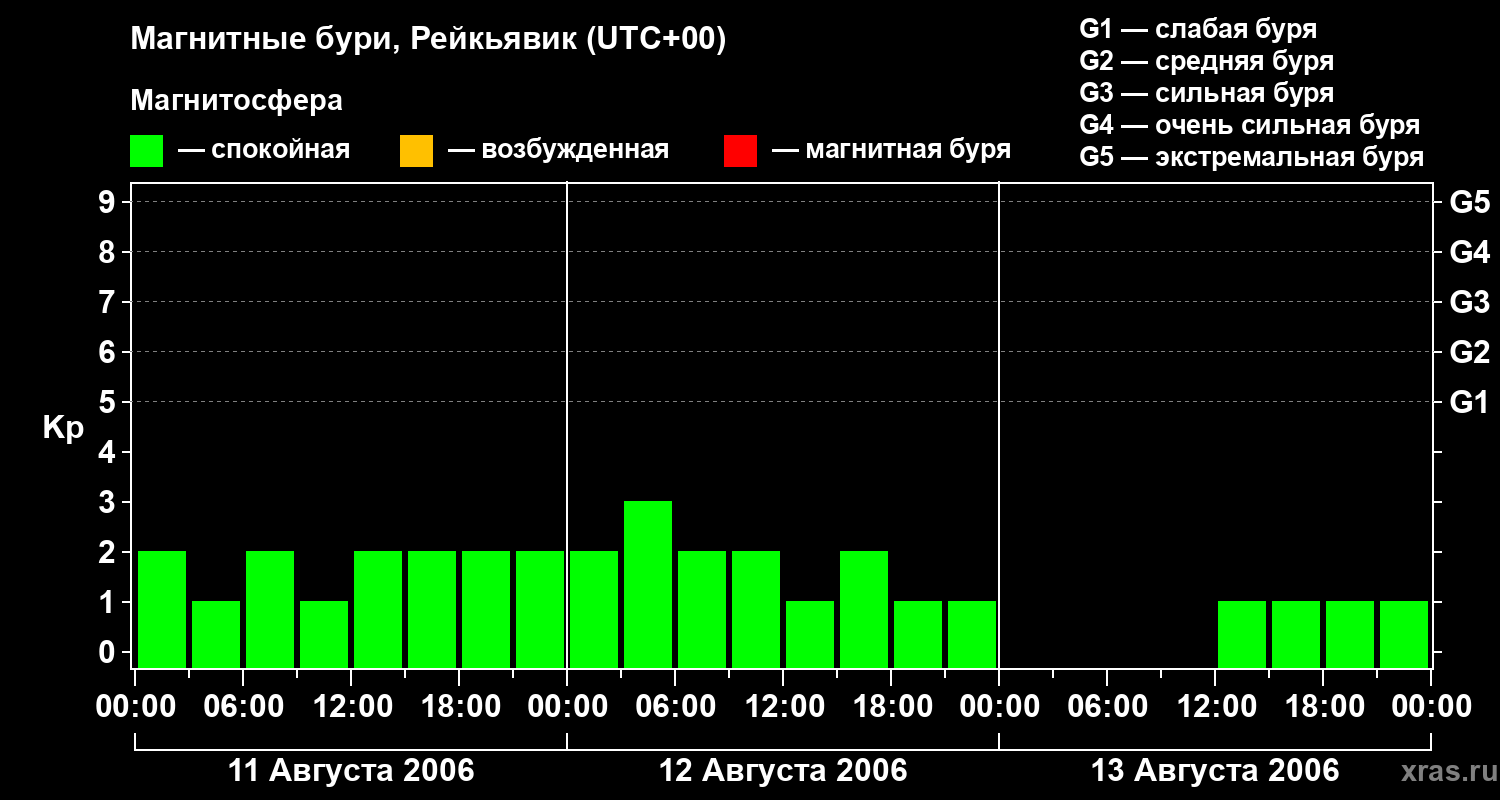Изменения геомагнитного индекса Kp с 11 по 13 августа 2006 года для средних широт
