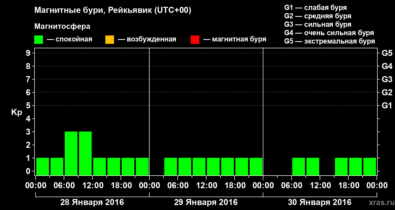 Изменения геомагнитного индекса Kp с 28 по 30 января 2016 года для средних широт