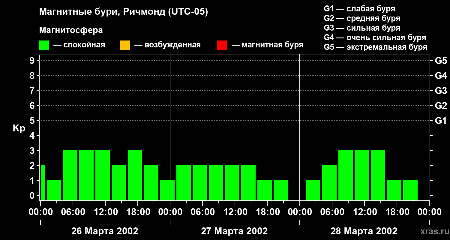 Изменения геомагнитного индекса Kp с 26 по 28 марта 2002 года для средних широт