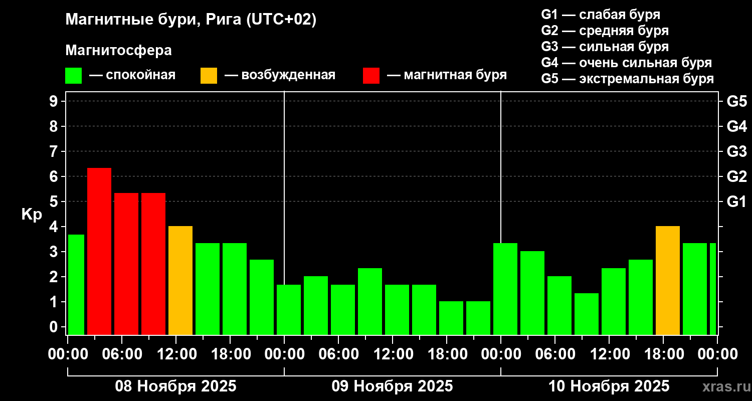 Изменения геомагнитного индекса Kp с 8 по 10 ноября 2025 года для средних широт