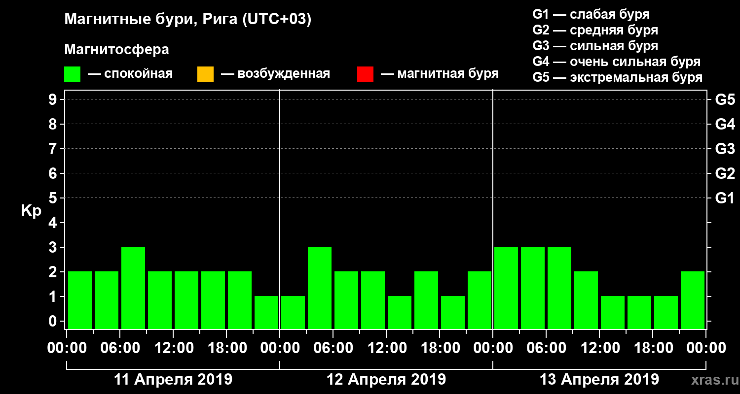 Изменения геомагнитного индекса Kp с 11 по 13 апреля 2019 года для средних широт