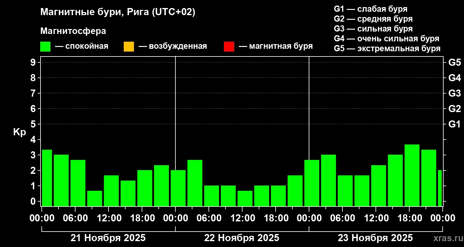 Изменения геомагнитного индекса Kp с 21 по 23 ноября 2025 года для средних широт