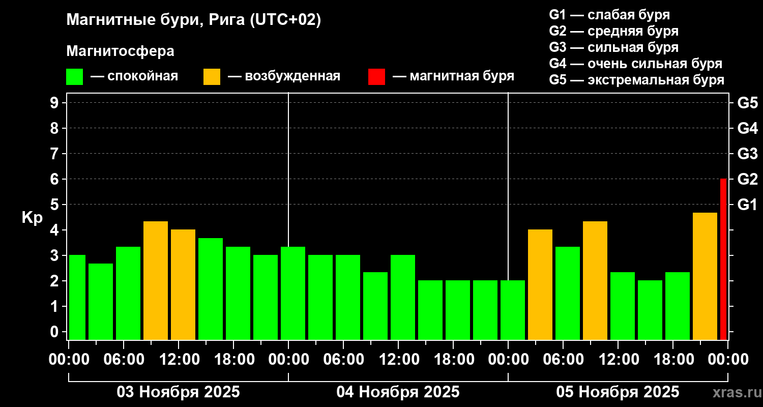 Изменения геомагнитного индекса Kp с 3 по 5 ноября 2025 года для средних широт
