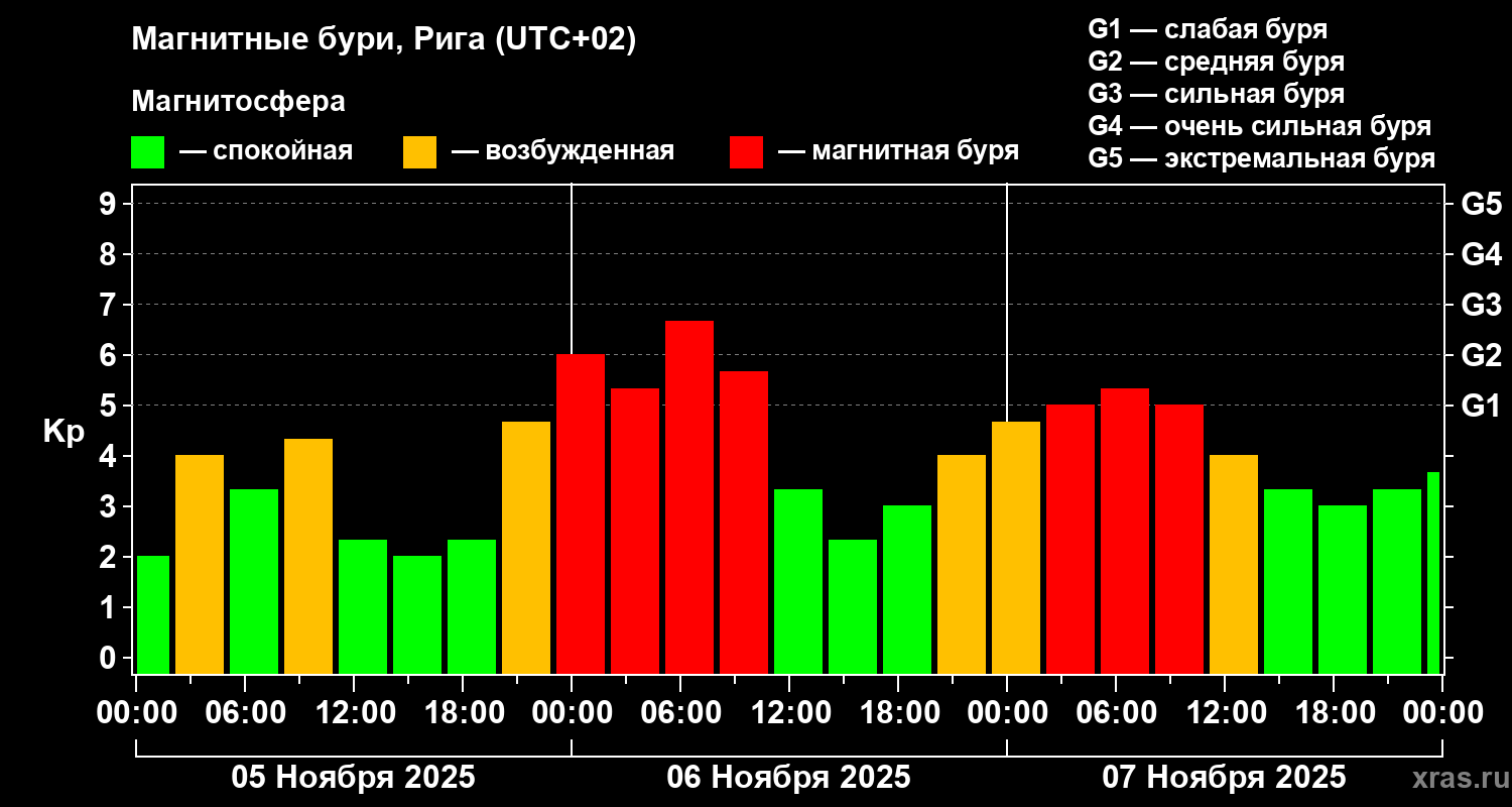 Изменения геомагнитного индекса Kp с 5 по 7 ноября 2025 года для средних широт
