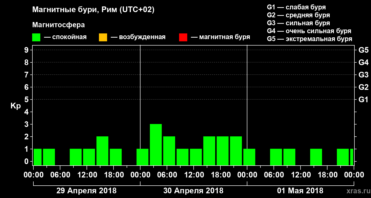 Изменения геомагнитного индекса Kp с 29 апреля по 1 мая 2018 года для средних широт