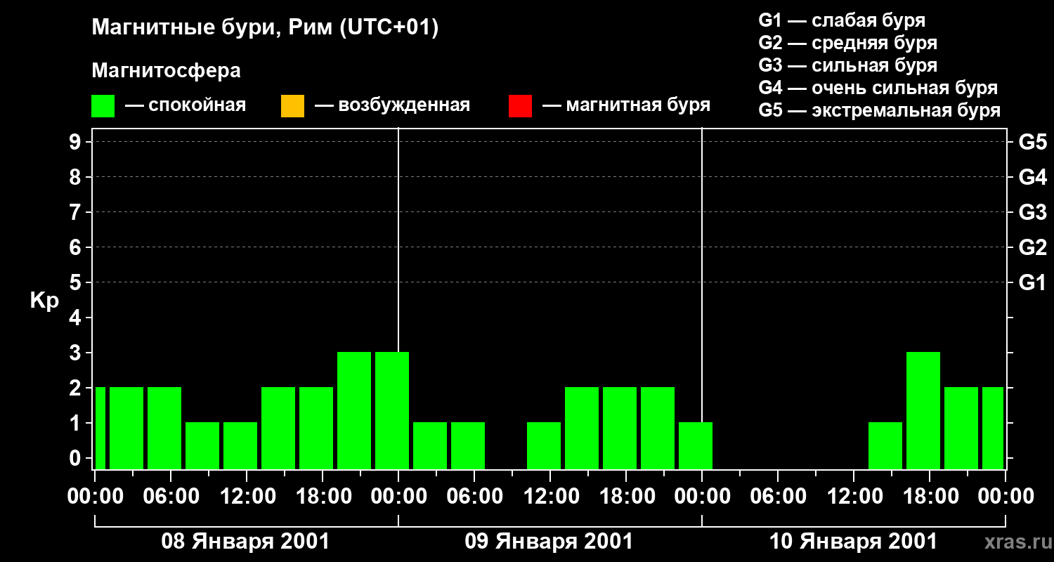Изменения геомагнитного индекса Kp с 8 по 10 января 2001 года для средних широт