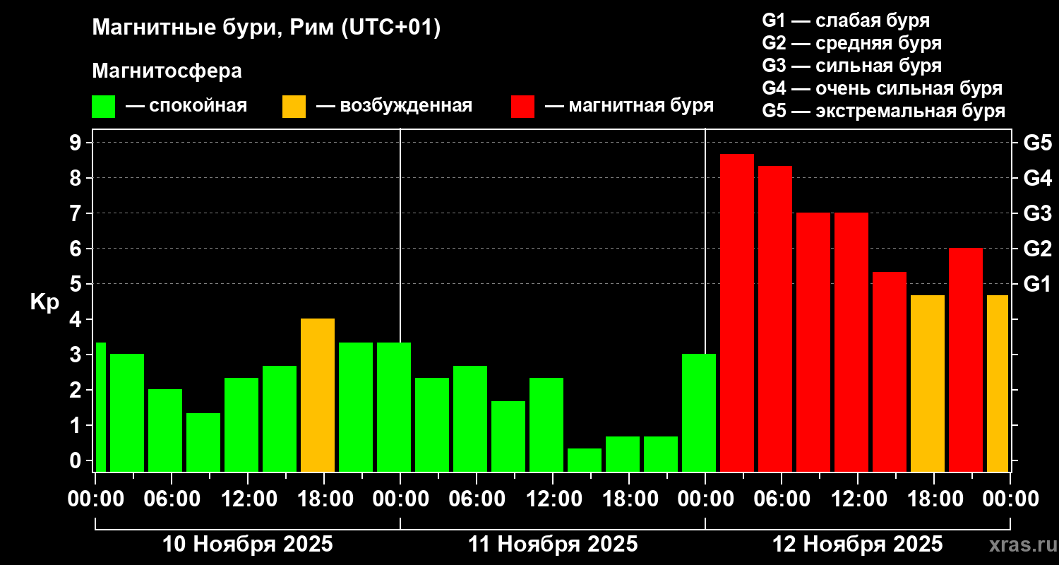 Изменения геомагнитного индекса Kp с 10 по 12 ноября 2025 года для средних широт