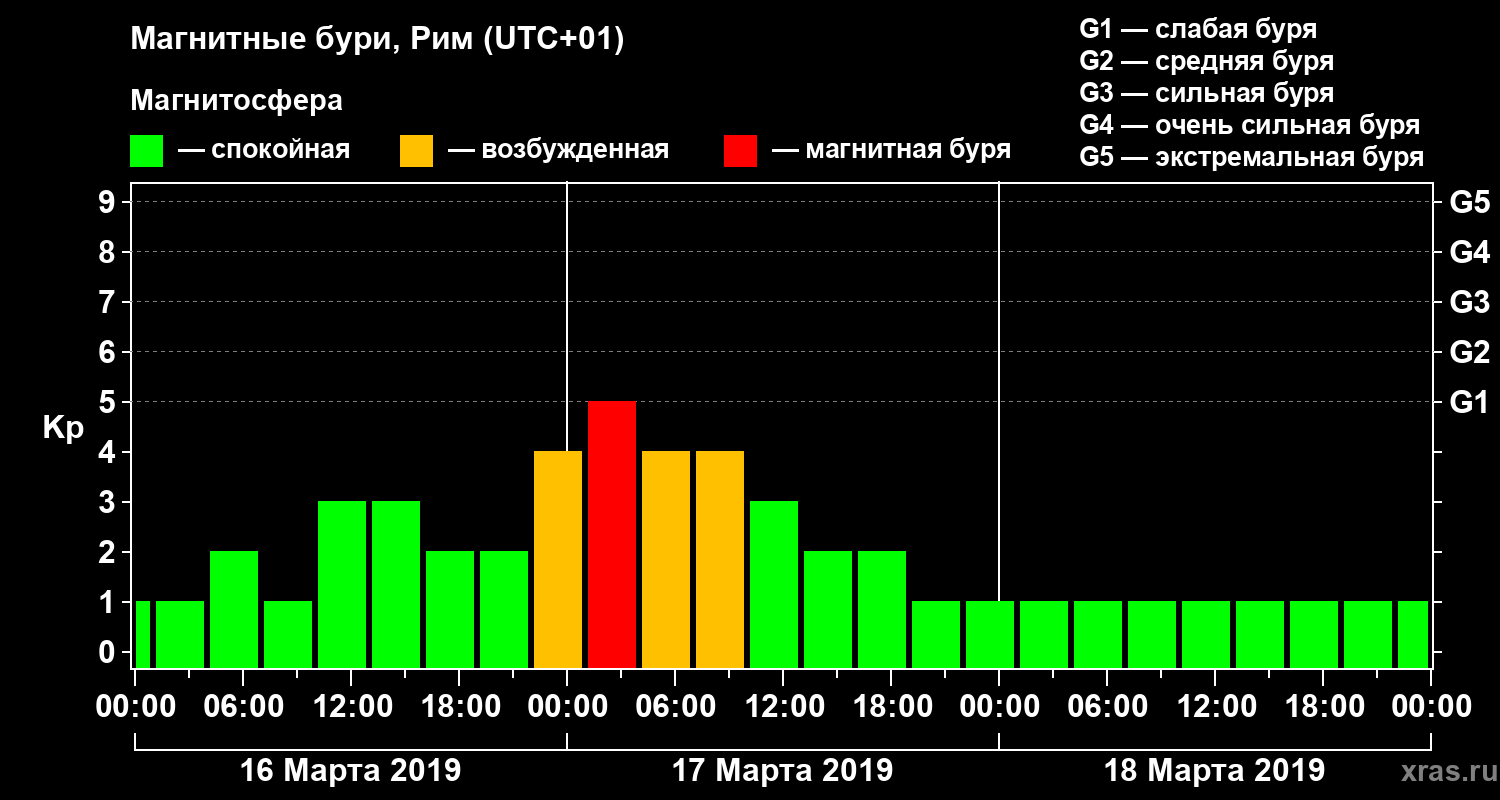 Изменения геомагнитного индекса Kp с 16 по 18 марта 2019 года для средних широт