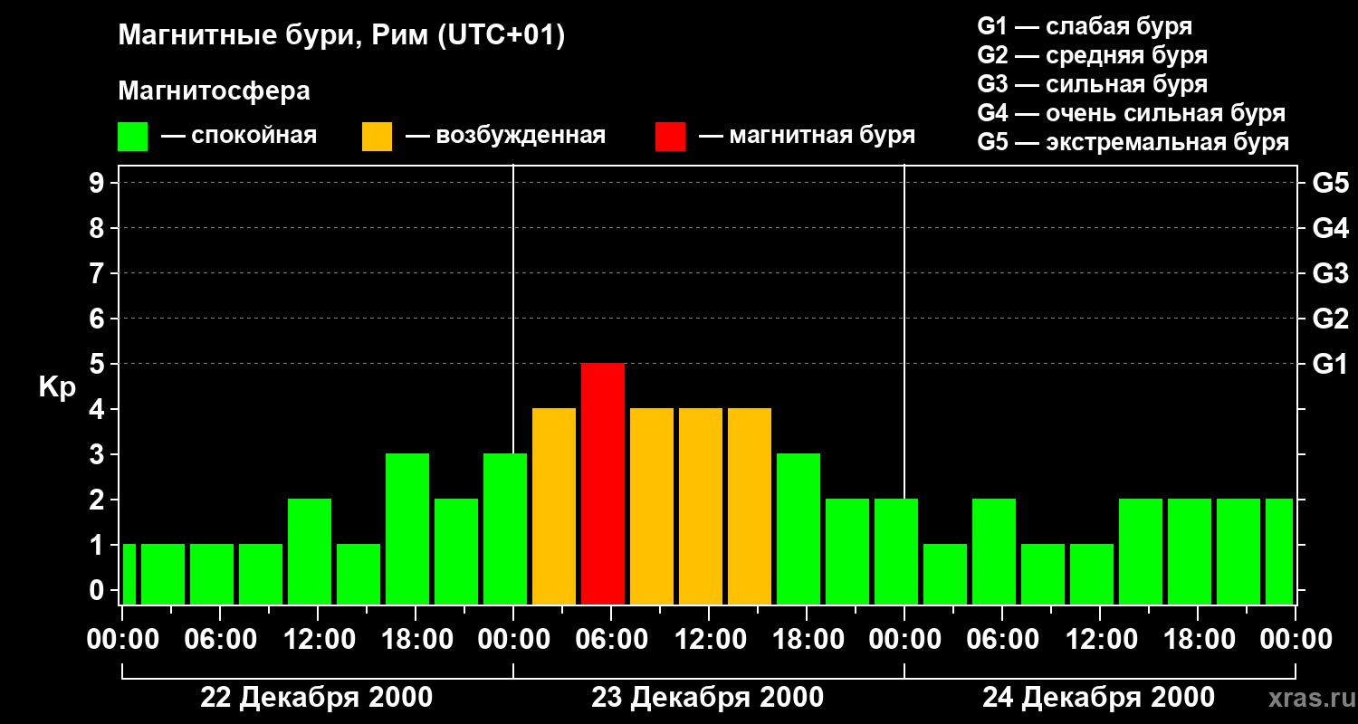 Изменения геомагнитного индекса Kp с 22 по 24 декабря 2000 года для средних широт