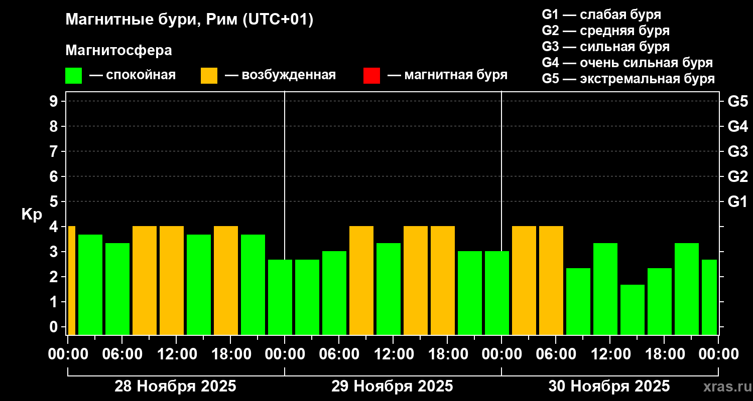 Изменения геомагнитного индекса Kp с 28 по 30 ноября 2025 года для средних широт