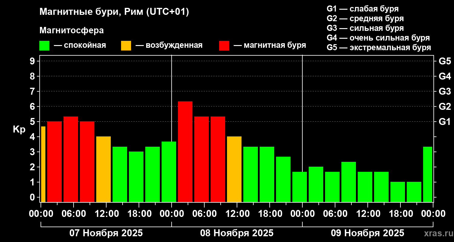 Изменения геомагнитного индекса Kp с 7 по 9 ноября 2025 года для средних широт