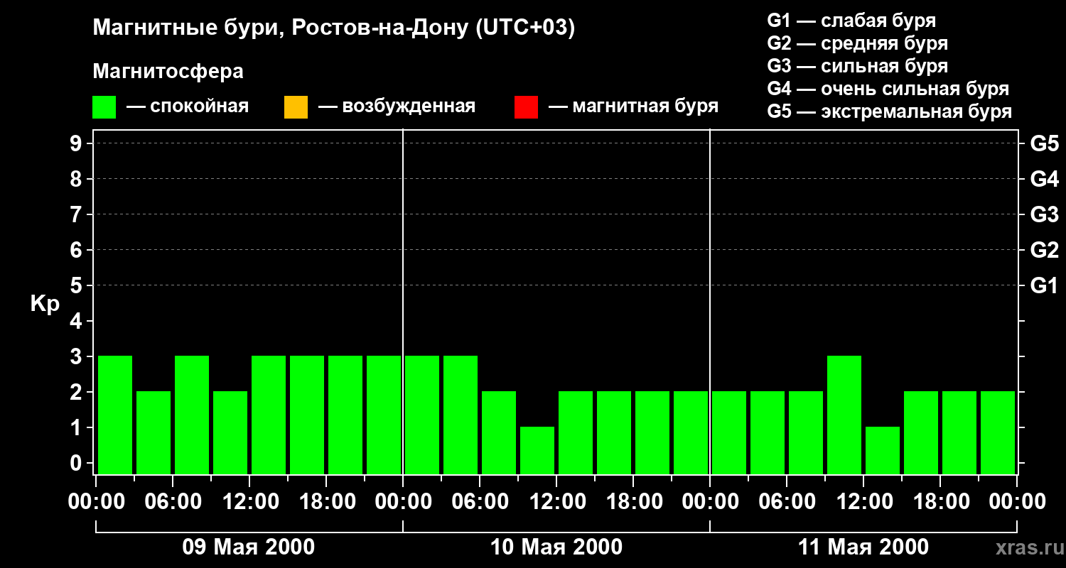 Изменения геомагнитного индекса Kp с 9 по 11 мая 2000 года для средних широт