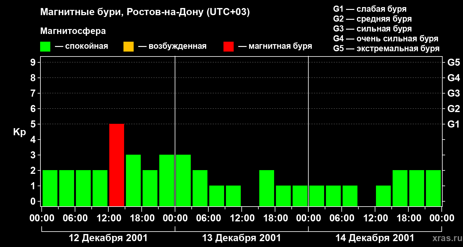 Изменения геомагнитного индекса Kp с 12 по 14 декабря 2001 года для средних широт