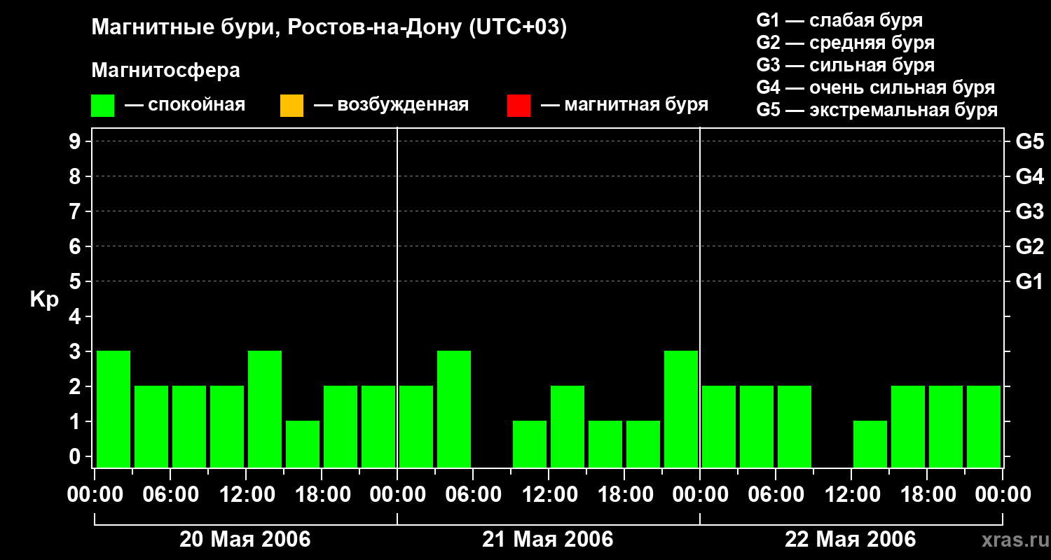 Изменения геомагнитного индекса Kp с 20 по 22 мая 2006 года для средних широт