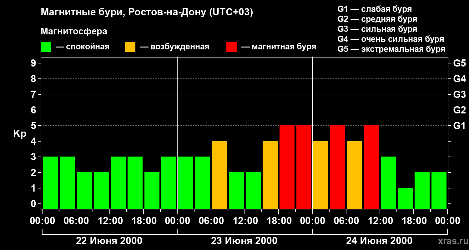 Изменения геомагнитного индекса Kp с 22 по 24 июня 2000 года для средних широт