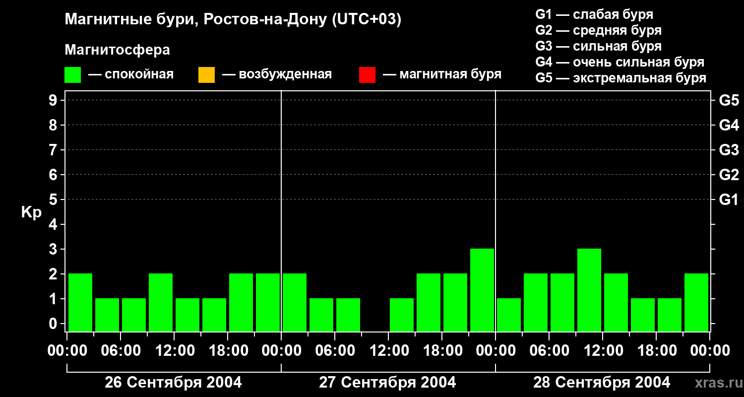 Изменения геомагнитного индекса Kp с 26 по 28 сентября 2004 года для средних широт