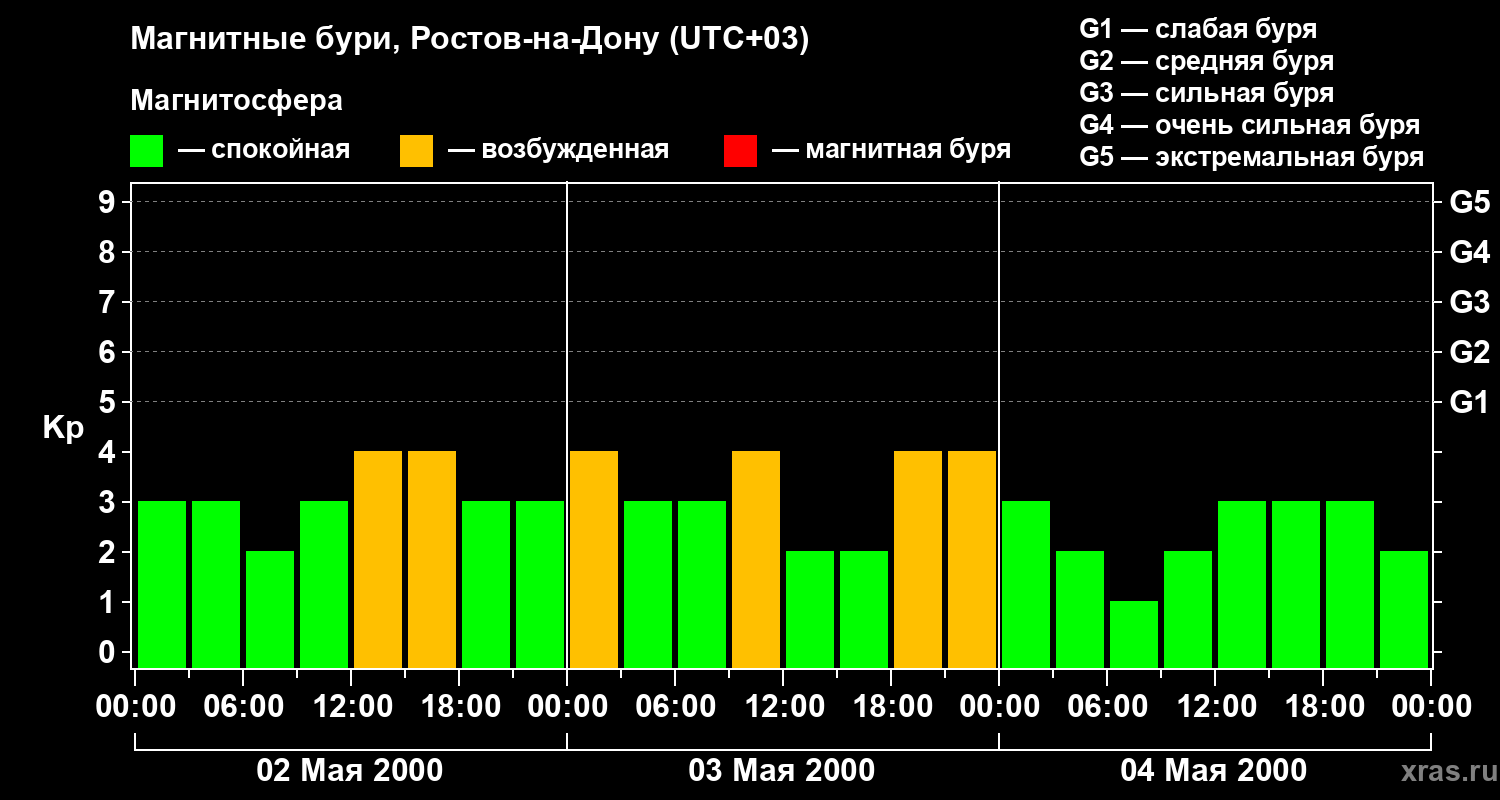 Изменения геомагнитного индекса Kp с 2 по 4 мая 2000 года для средних широт